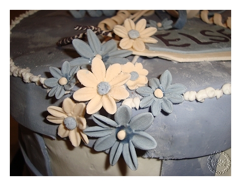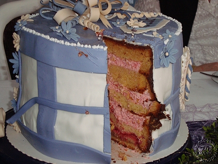 Da die Torte relativ hoch sein musste, konnte ich als Grundbasis keinen Bisquitteig wählen. Ich entschied mich für den Eierlikörkuchen nach dem Rezept der Tortentante. Sehr köstlich und saftig. Ich habe das Rezept zweimal in einer 28er Springform gebacken. Die Füllung sollte leicht sein - keine Buttercreme. Hier wählte ich eine Erdbeer-Joghurt-Creme. Nach dem Füllen wurde die Torte mit einer Zartbitterganache umhüllt und dann mit Fondant ummantelt. Die Dekoblüten, Schleifen und die Brosche hatte ich schon ein paar Tage zuvor aus selbstgemachter Blütenpaste vorbereitet. Trotzdem war es eine ganz schöne Arbeit aber meine Oma hat sich gefreut und geschmeckt hat die Torte auch!