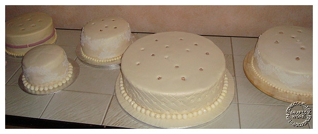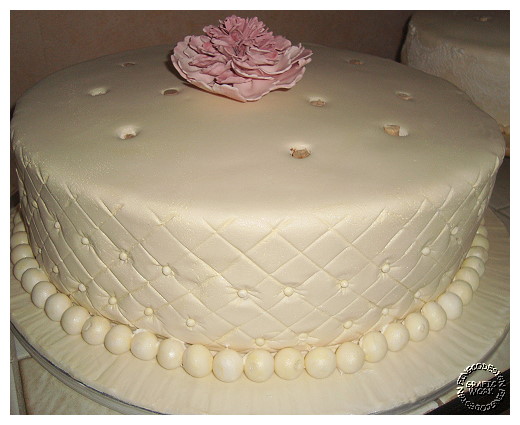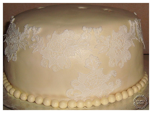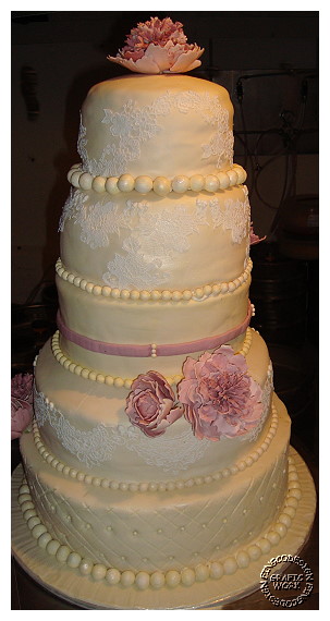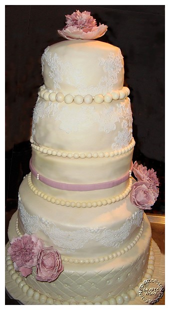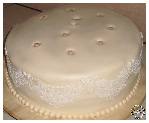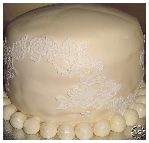 Und auch Torte Nr. 5, die oberste, bekam eine Spitzendekoration und auf Wunsch der Braut, einen Rand aus besonders großen Perlen. Die Perlen habe ich mit Icing befestigt. Auf diesem Foto erkennt man den Perlenglanz besser. | ||