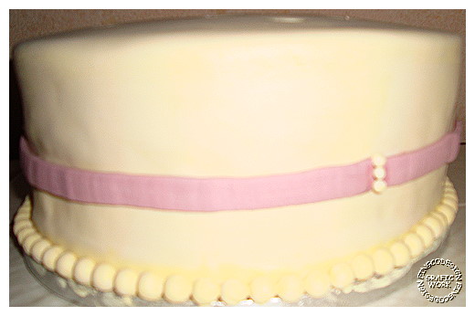 Die dritte Torte bekam ein rosafarbenes Band, dreimal unterbrochen von kleinen Perlen und ebenfalls einen unteren Perlenrand. Die Farben auf dem Foto sind leider nicht gut geworden. Die Torte sieht genauso aus wie die anderen. | ||