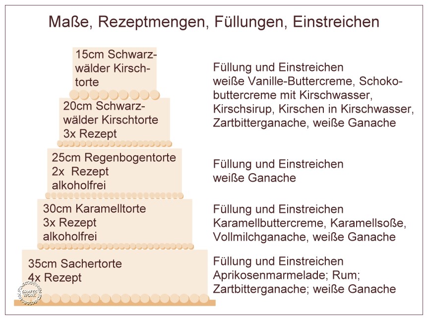 Am Dienstag waren alle Böden gebacken, am Mittwoch habe ich dann die verschiedenen Füllungen hergestellt. Auf frische Sahne habe ich komplett verzichtet, da ich wegen der Haltbarkeit Bedenken hatte. Somit wurde die 2. Torte mit Ganache, Karamellsoße und Karamellbuttercreme gefüllt. Die dritte Torte, eine Regenbogentorte, füllte ich mit weißer Ganache und die beiden oberen Torten waren Schwarzwälderkirschtorten, gefüllt mit Kirschen sowie heller und dunkler Buttercreme. | ||