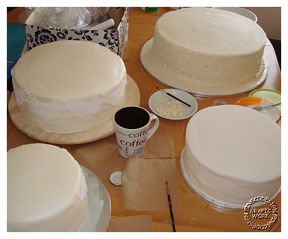 Nachdem alle Torten mit Fondant eingedeckt und mit Perlglanz überzogen waren ging es an die Dekoration. | ||