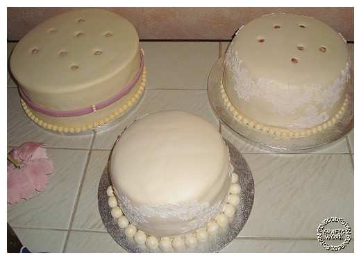 Die zweite Torte wurde mit Spitze und kleinen Schleifchen romantisch dekoriert. Der Perlenrand bestand aus mittelgroßen Perlen. Auch hier wurden Rundhölzer zum Tragen der weiteren Torten eingebracht. | ||