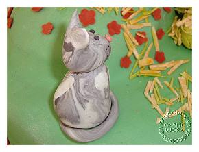 Für die Strohballen habe ich einen entsprechend großen "Block" aus Modellierfondant in einem gelbgrünlichen Farbton geformt und einen Tag trocknen lassen. Aus dünn ausgerollten Streifen Modellierfondant in verschiedenen heuähnlichen Farbtönen habe ich mit einem Messer kleine Spelzen abgeschnnitten. Diese habe ich dann auch trocknen lassen und am nächsten Tag habe ich die Späne mit Zuckerkleber an die Blöcke geklebt. Die "Strohreste" wurde dann noch mehr oder weniger dekorativ auf der Torte und am Rand verteilt (auch mit Zuckerkleber angeklebt). Hierbei den Kleber nur sparsam verwenden, damit sich die Späne nicht auflösen oder glänzen.